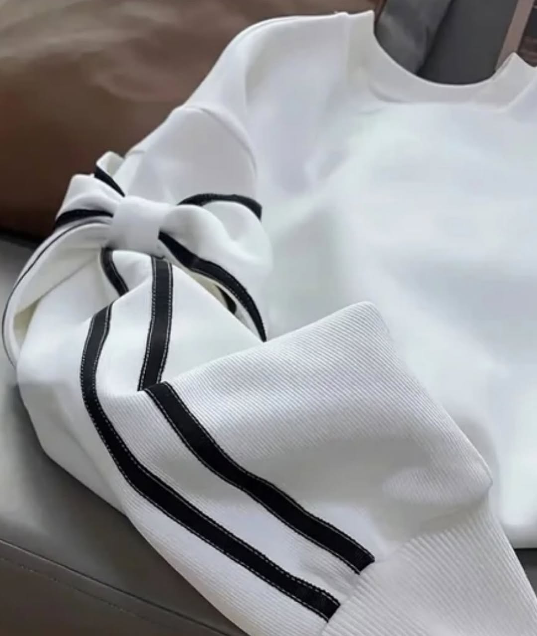 - طراحی فانتزی و خاص با پاپیون بزرگ و نوارهای تزئینی کنتراست روی آستین، مناسب استایل کژوال، خیابانی و خاصپسند